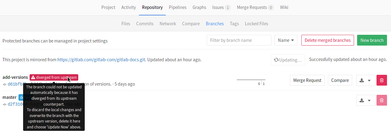 If you do manually update a branch in the GitLab repository, the branch will become diverged from upstream, and GitLab will no longer automatically update this branch to prevent any changes from being lost.