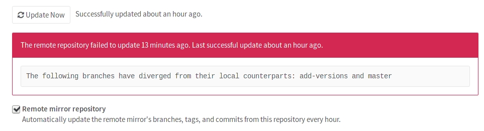 In case of a diverged branch, you will see an error indicated at the Mirror repository settings.