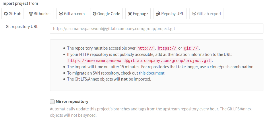 https://username@gitlab.company.com/group/project.git. In some cases, you might need to use a personal access token instead of a password, e.g., you want to mirror to GitHub and have 2FA enabled. - The import will time out after 15 minutes. For repositories that take longer use a clone/push combination.